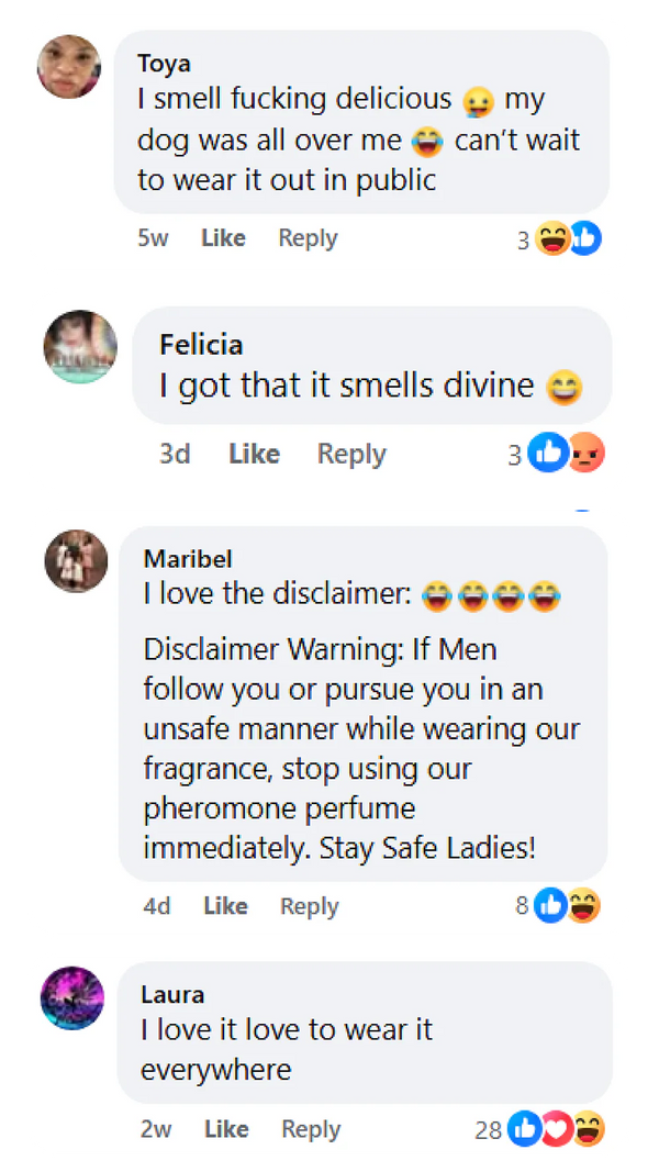 Disclaimer Warning: If Men follow you or pursue you in an unsafe manner while wearing our fragrance, stop using our pheromone perfume immediately.